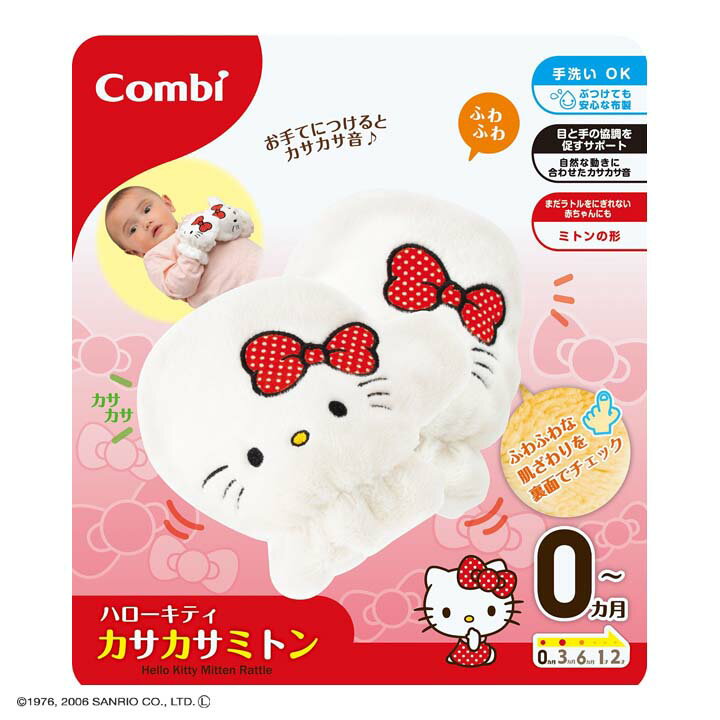 【手洗いOK】ぶつけても安心な布製 【目と手の協調を促すサポート】自然な動きに合わせたカサカサ音 【まだラトルをにぎれない赤ちゃんにも】ミトンの形●対象年齢:0歳〜【ベビーおもちゃ ラトル 知育玩具 赤ちゃんのおもちゃ キティちゃん サンリオ COMBI】コンビ